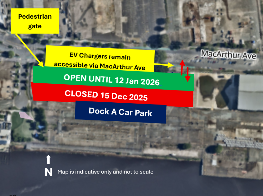 A new pedestrian crossing will be installed to provide a safe connection between The Yard Car Park and Dock C. It will connect with the existing footpath on the southern side of MacArthur Avenue near Flipside Circus. During the pedestrian crossing installation works, short term traffic changes will be required. Please follow the direction of signage and traffic control for your safety.